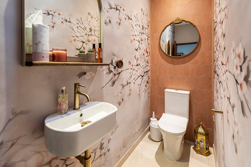 The guest bathroom is a jewel box of beauty. Despite its compact footprint, it bursts with personality thanks to the soft, romantic floral wall covering that wraps the space in tranquility. Blush-toned scallop tiles line the back wall, adding texture and subtle color contrast. A petite wall-mounted sink with brushed brass fittings maximizes space without sacrificing style. A vintage-style mirror and delicate accessories complete the look—inviting, refined, and unforgettable.